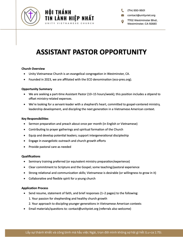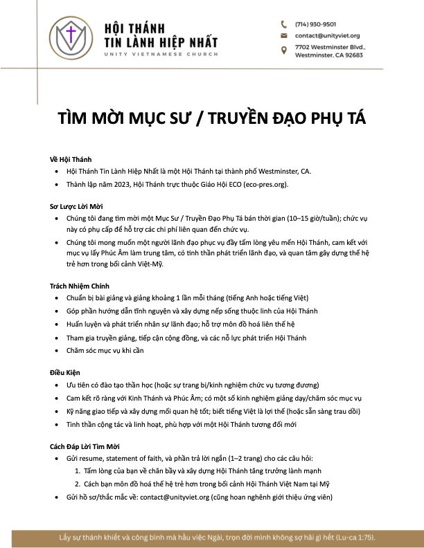 Unity Vietnamese Church is an Evangelical Church of ECO Presbyterian: https://eco-pres.org/churches/unity-vietnamese-church dedicated to worshiping the Lord, growing in faith, and serving the Vietnamese-American community. We embrace the transformative power of the Gospel of Jesus Christ, focusing on cultivating strong relationships with God and applying His teachings to positively impact our community.